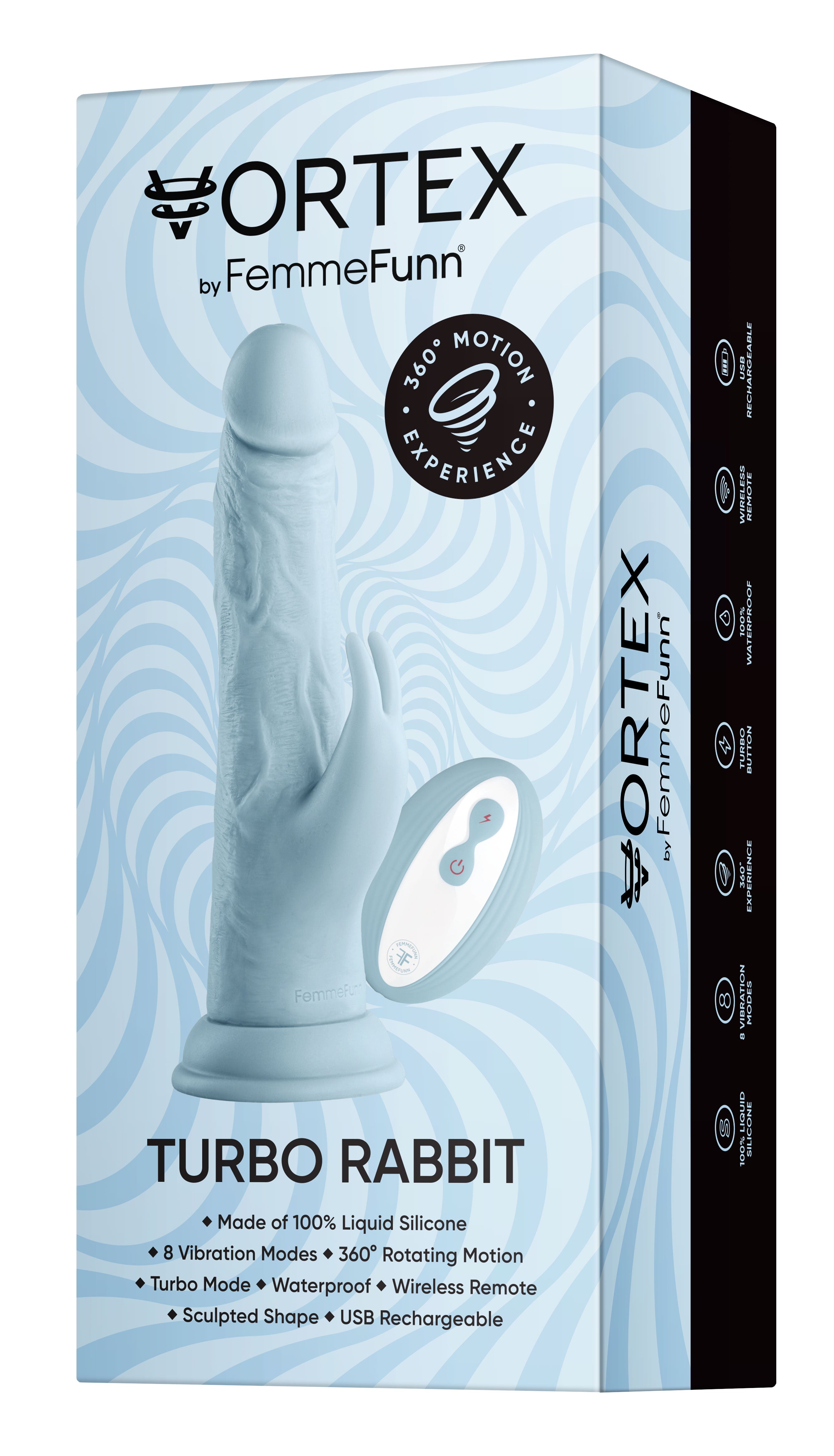 Have fun the way you like it! VORTEX Turbo Rabbit is waterproof, wireless, and equipped with a suction cup compatible with most strap-on harnesses.