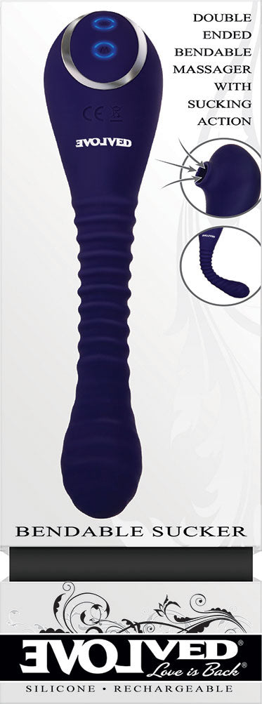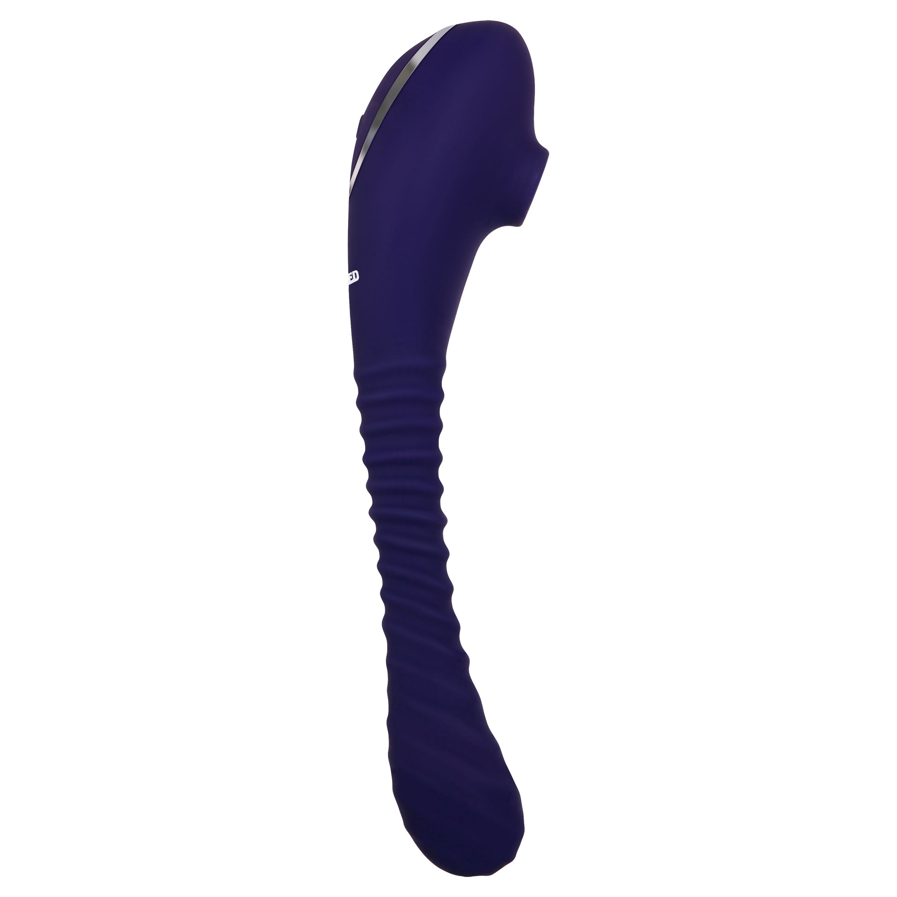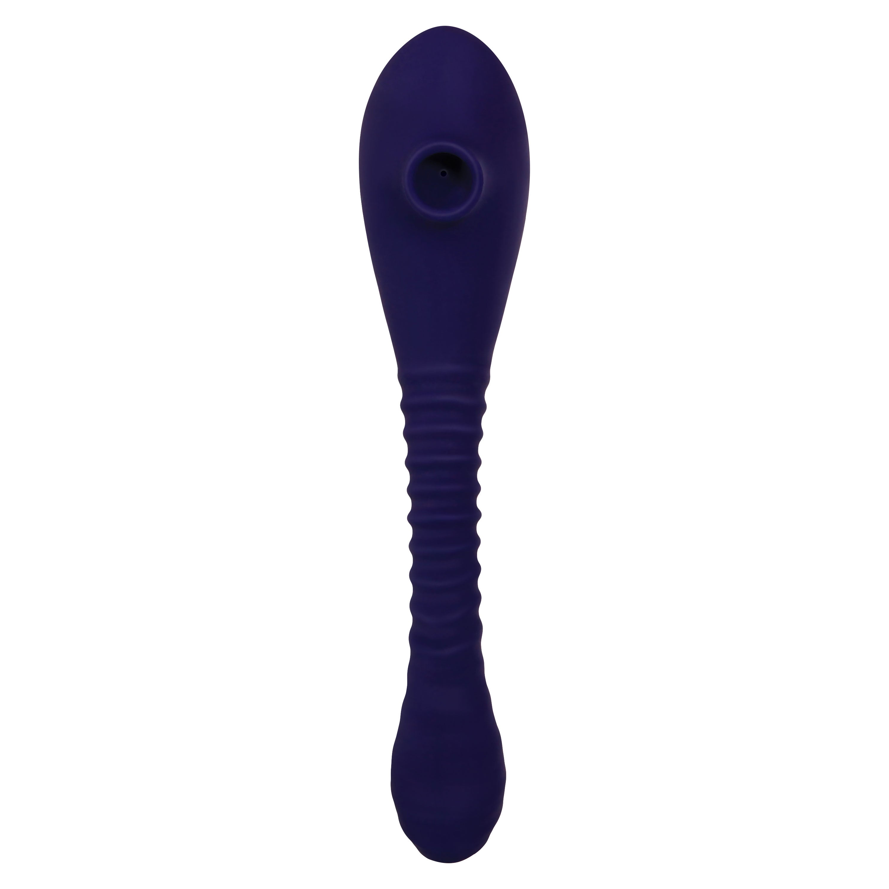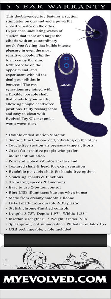 This double-ended toy features a suction stimulator on one end and a powerful ribbed vibrator on the other. Experience undulating waves of suction that tease and target the clitoris with an extraordinary touch-free feeling that builds intense pleasure in even the most sensitive people. Flip the toy to enjoy the slim, textured vibe on the opposite end, and experiment with all the dual possibilities in between! The two sensations are joined with a flexible, posable shaft that bends to your needs, allowing unique hands-free positions. Fully rechargeable and easy to clean with Evolved Toy Cleaner and a warm water rinse.