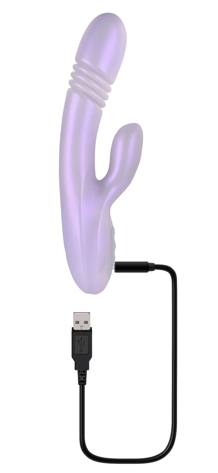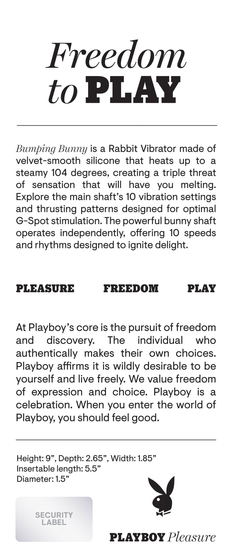 Bumping Bunny is vibrator made of velvet-smooth silicone that heats up to a steamy 104 degrees, creating a triple threat of sensation that will have you melting. Explore the main shaft's 10 vibration settings and thrusting patterns designed for optimal G-Spot stimulation. The powerful bunny shaft operates independently, offering 10 speeds and rhythms designed to ignite delight.
