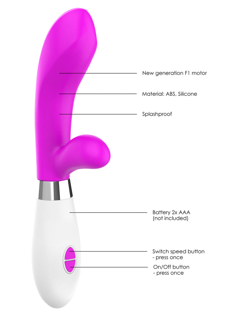 The Achilles has, in this case, its strongest point in the "heel" of the vibrator. The robust execution of the clitoral stimulator will make you gasp for air when you reach the big "O"! Made of high-grade silicone and ABS. Comes with 2 extra strong F1 motors revving up to 5200rpm and 15000rpm in the curved tip for perfect G-spot stimulation! The 10 different speed modes will make sure there is always something for everyone and at less than 60dB no one but you will know about your secret rendezvous. This beautiful toy is battery operated. Just put 2 AAA batteries and enjoy a undisturbed pleasurous playtime!