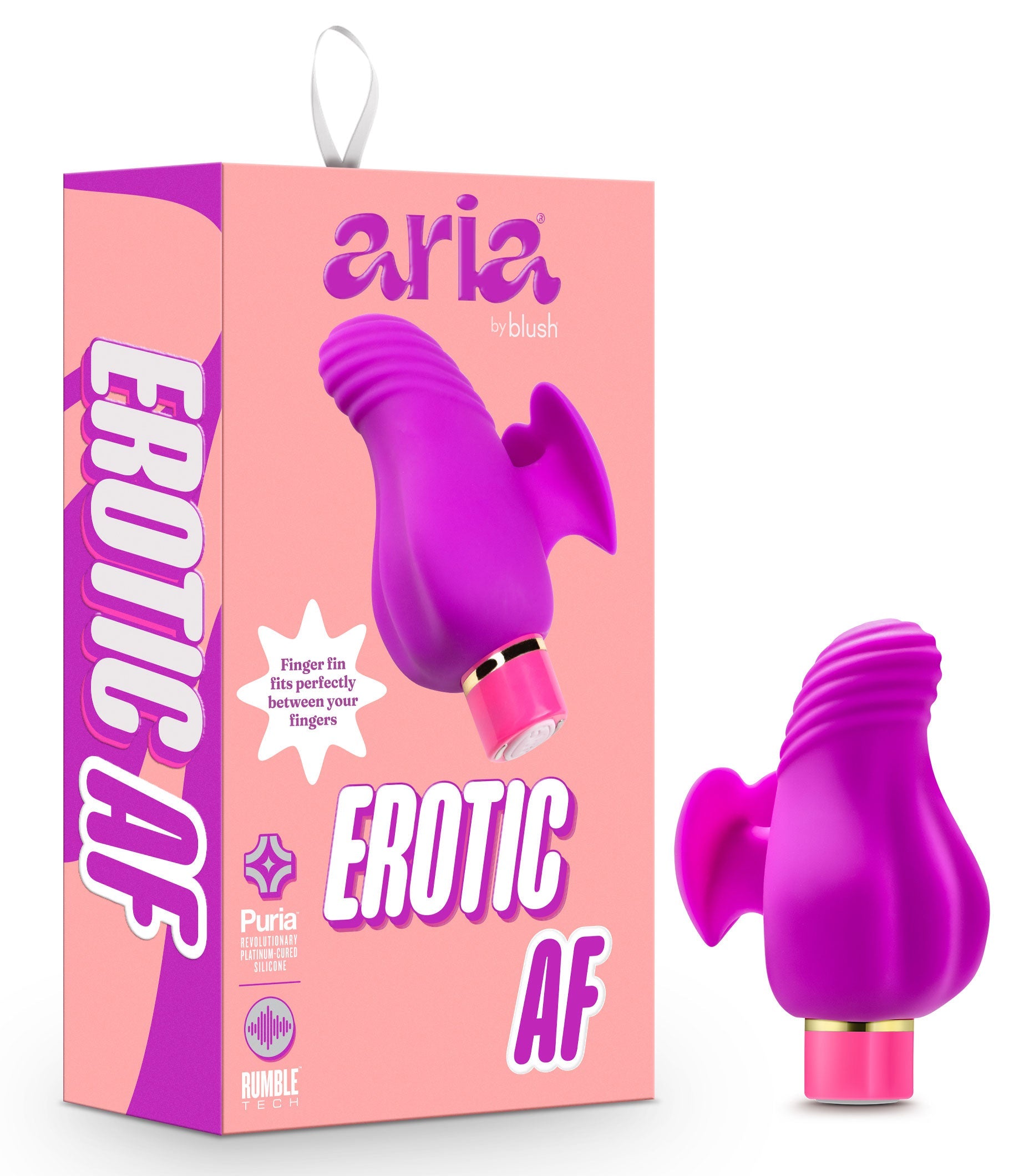 Beautiful and powerful, meet the Aria Erotic AF. It has 10 deep, powerful Rumble Tech motor. Erotic AF is rated IPX7 submersible waterproof, making it perfect for bath and ahower fun and easy to clean and is Magna Charge USB magnetic rechargeable, cable included. It has a curved design that fits beautifully against the body and ribbed head for extra stimulation. Erotic AF also has a heart-shapd finger fin for easier grip and acdesibility! Ultrasilk smooth and made using body-safe Puria platinum-cured silicone, it's free of phthalates, paraffins, latex, and fragrances. Embrace the power of Aria.