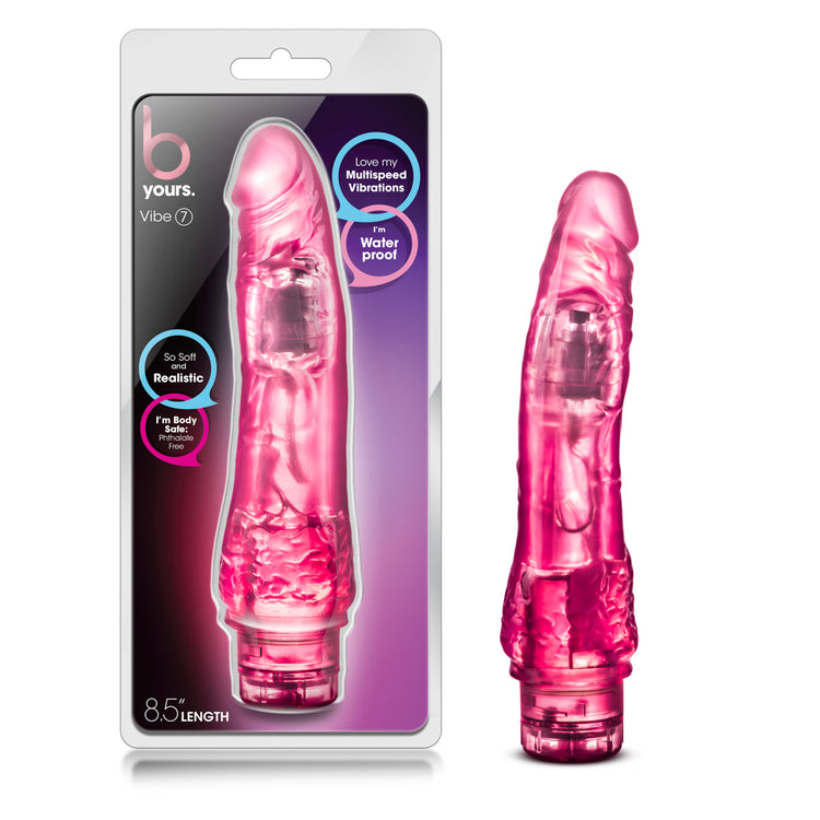 The B Yours Vibe 7 will rock your world. B Yours Vibe #7 is an 8.5 inch speed vibrations and is waterproof for shower and bath time. The perfect choice for a first time toy purchase and for the cost conscious. Made of fragrance and Phthalate Free PVC: this toy is body safe and easy to clean!