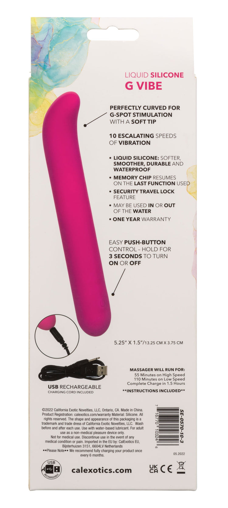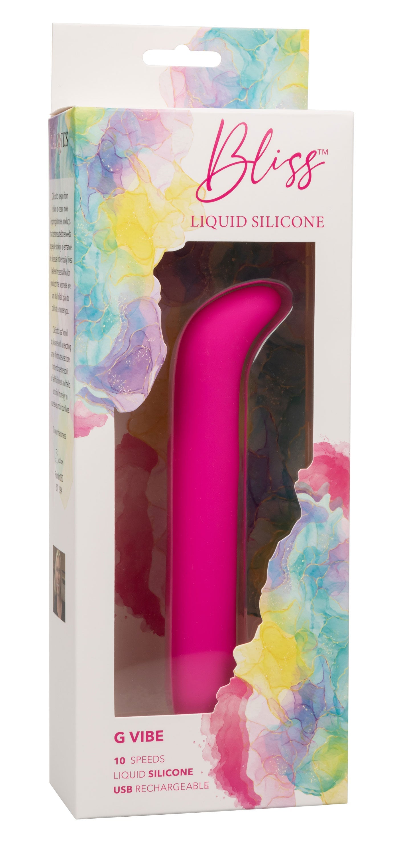 Indulge in a pleasure paradise with the teasing Bliss Liquid Silicone G Vibe. This sensational vibe features an intimately curved tip, body-forming liquid silicone design, and 10 powerful speeds of vibration. The curved tip and 100% liquid silicone body are perfect for caressing internal and external sweet spots. Get playful with each increase of the 10 incremental speeds of vibration with the easy-touch control button. Effortlessly control pure pleasure with an easy-touch silicone button and hold for 3 seconds to turn on or off. The ultra-plush liquid silicone is great for exploring sensual sweet spots and intimate pleasure points with ease. Use the smooth single button control to enjoy up to 110 minutes of vibrating pleasure. Charge up your passion in only 1.5 hours by plugging the provided USB cable into the self-sealing charging port on the base of the massager.