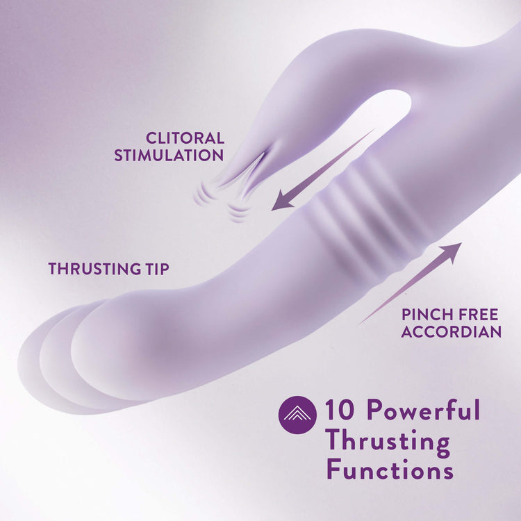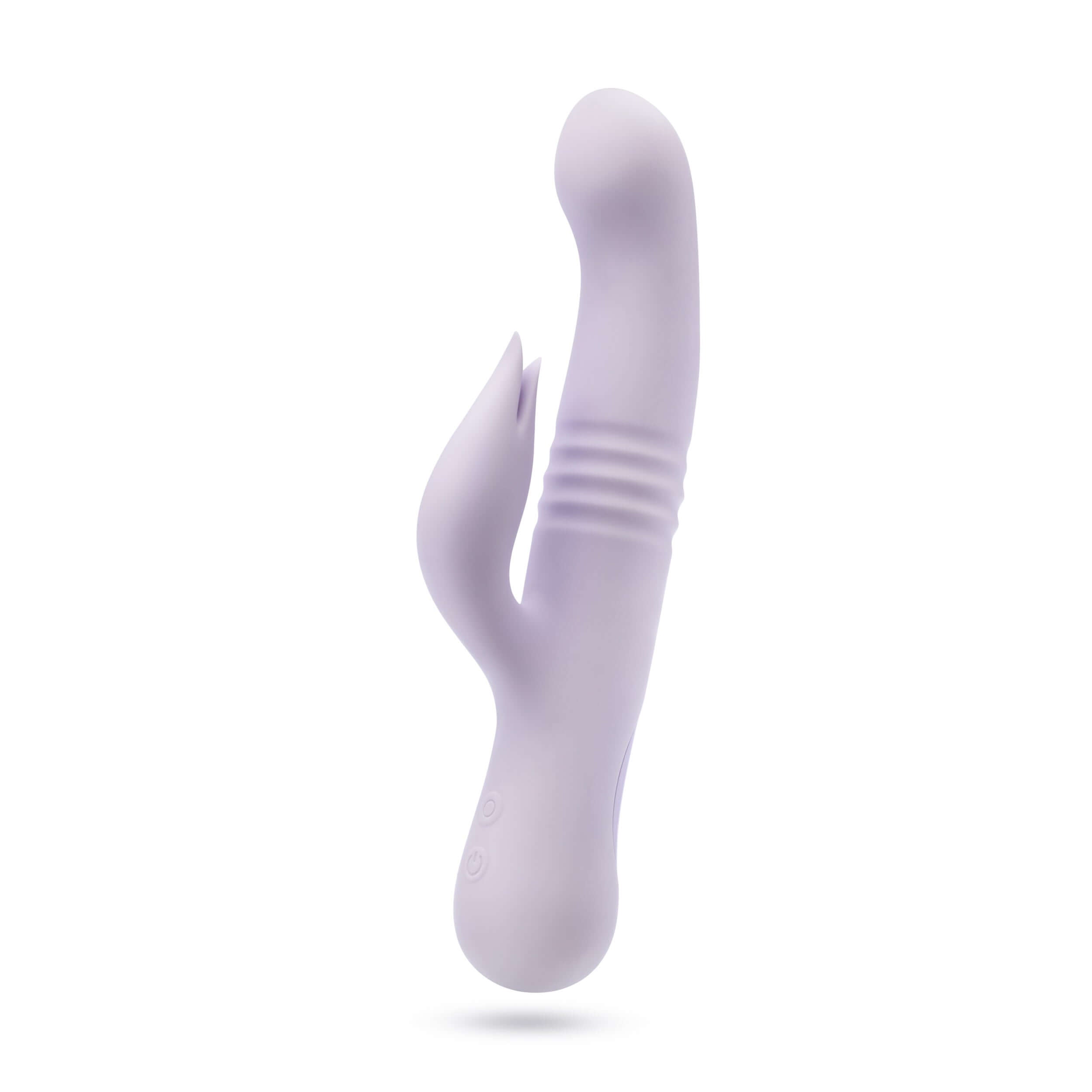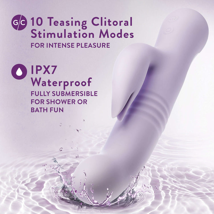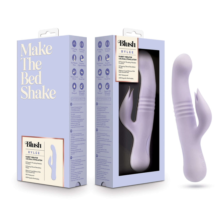 Introducing Rylee, the sleek and energetic rabbit vibrator that will Make The Bed Shake. With its elegant design, this dual stimulator offers a world of clitoral and G-spot sensations. Its rounded head is curved for comfortable insertion, featuring 10 powerful thrusting vibrations, with 3 progressive speeds and 7 creative patterns that passionately romances your G-spot. The clitoral stimulator adds 10 additional discreet vibrations, softly teasing and caressing your clitoris with delicate and tantalizing sensations. Crafted from body safe platinum-cured silicone, Rylee feels satin smooth against your skin, ensuring sensational comfort during use. With its IPX7 waterproof design and USB magnetic recharging, its ready to accompany you in the shower or bath for enhanced play. There are so many ways to inspire your most intimate moments with this massaging vibrator. Rylee is ready to go all the way till sunrise.