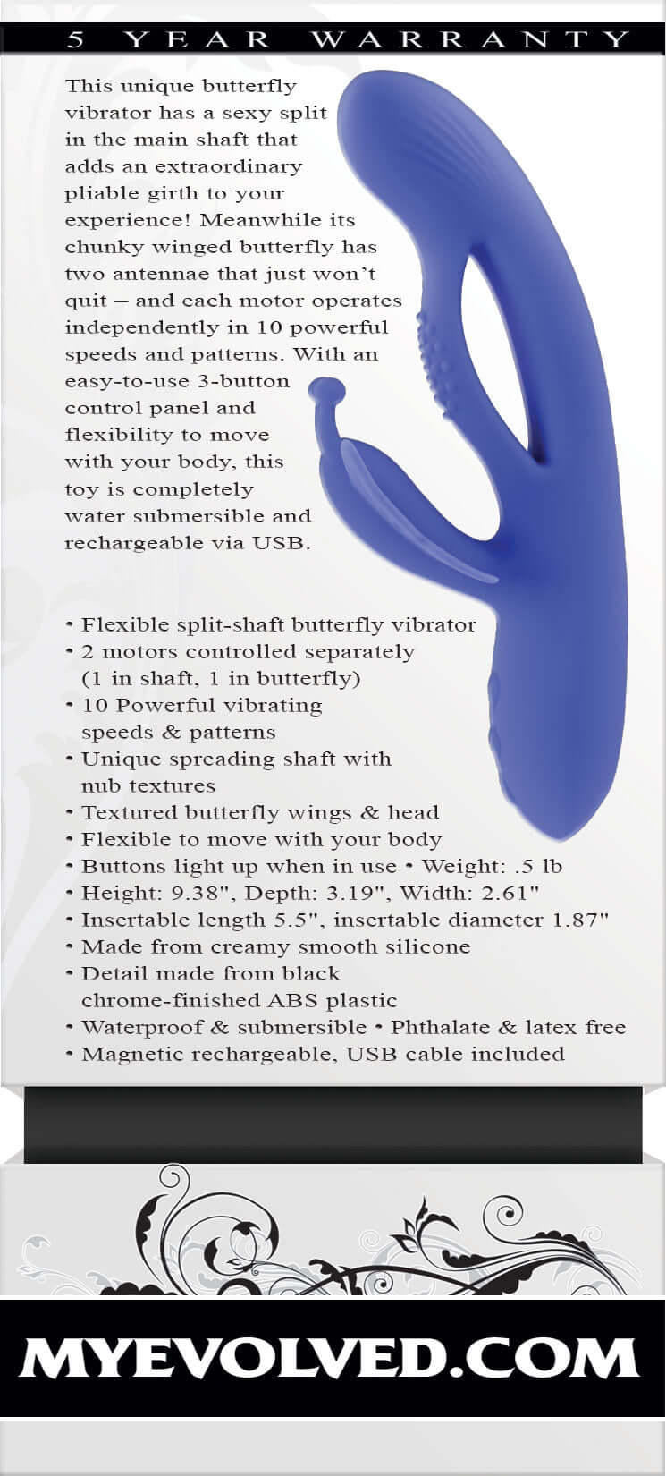 This unique butterfly vibrator has a sexy split in the main shaft that adds an extraordinary pliable girth to your experience! Meanwhile its chunky winged butterfly has two antennae that just won’t quit – and each motor operates independently in 10 powerful speeds and patterns. With an easy-to-use 3-button control panel and flexibility to move with your body, this toy is completely water submersible and rechargeable via USB.