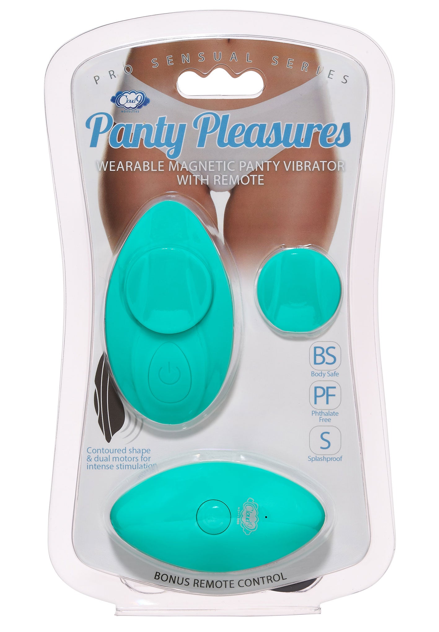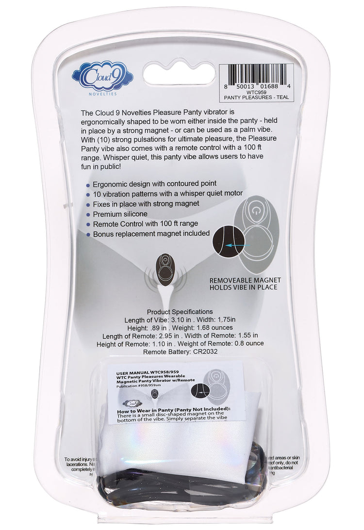 The Cloud 9 Novelties Pleasure Panty vibrator is ergonomically shaped to be worn either inside the panty, held in place by a strong magnet or can be used as a palm vibe. With 10 strong pulsations for ultimate pleasure, the Pleasure Panty vibe also comes with a remote control with a 100 feet range. Whisper quiet, this panty vibe allows users to have fun in public! Features: ergonomic design with contoured point. 10 vibration patterns with a whisper quiet motor. Fixes in place with strong magnet. Made using body safe, phthalate free Premium Silicone. Bonus silk storage pouch included.