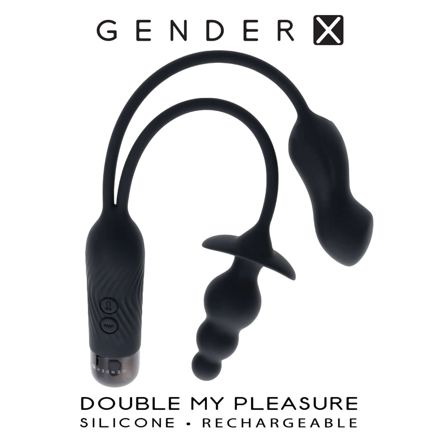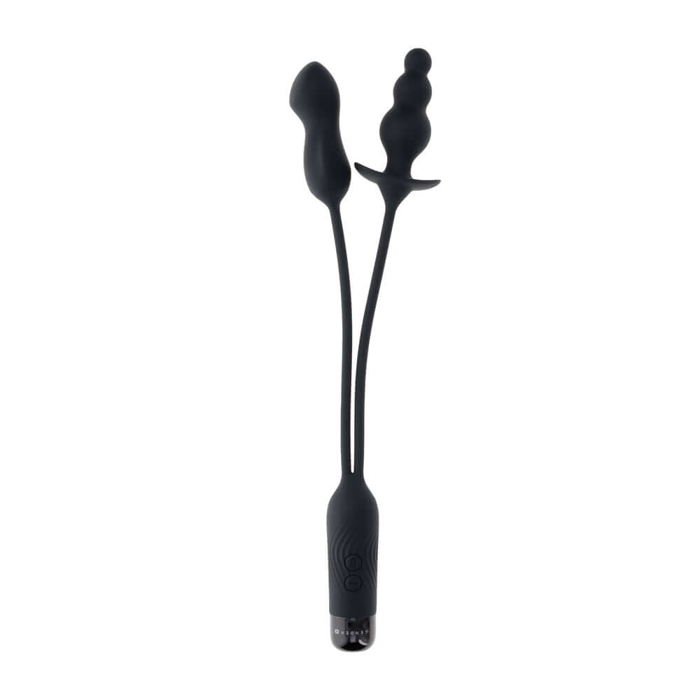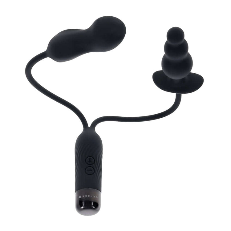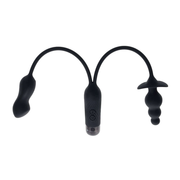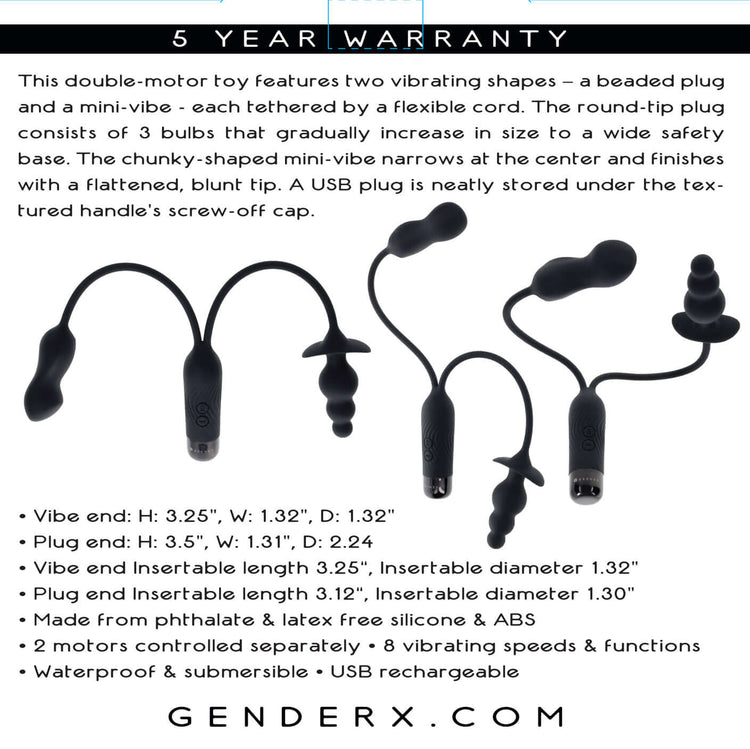This double-motor toy features two vibrating shapes - a beaded plug and a mini vibe - each tethered by a flexible cord. The rounded-tip plug consists of 3 bulbs that gradually increase in size to a wide safery base. The chunky-shaped mini-vibe narrows at the center and finishes with a flattened, blunt tip. A USB plug is neatly stored under the textured handle's screw-off cap.