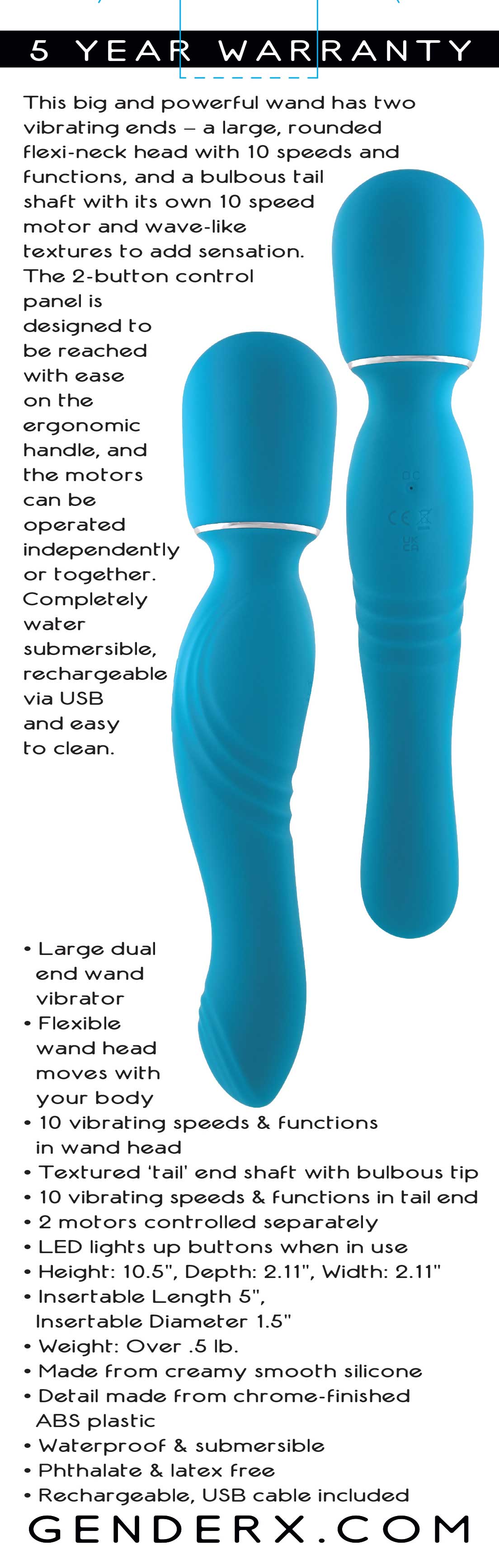 This big and powerful wand has two vibrating ends – a large, rounded flexi-neck head with 10 speeds and functions, and a bulbous tail shaft with its own 10 speed motor and wave-like textures to add sensation. The 2-button control panel is designed to be reached with ease on the ergonomic handle, and the motors can be operated independently or together. Completely water submersible, rechargeable via USB and easy to clean.