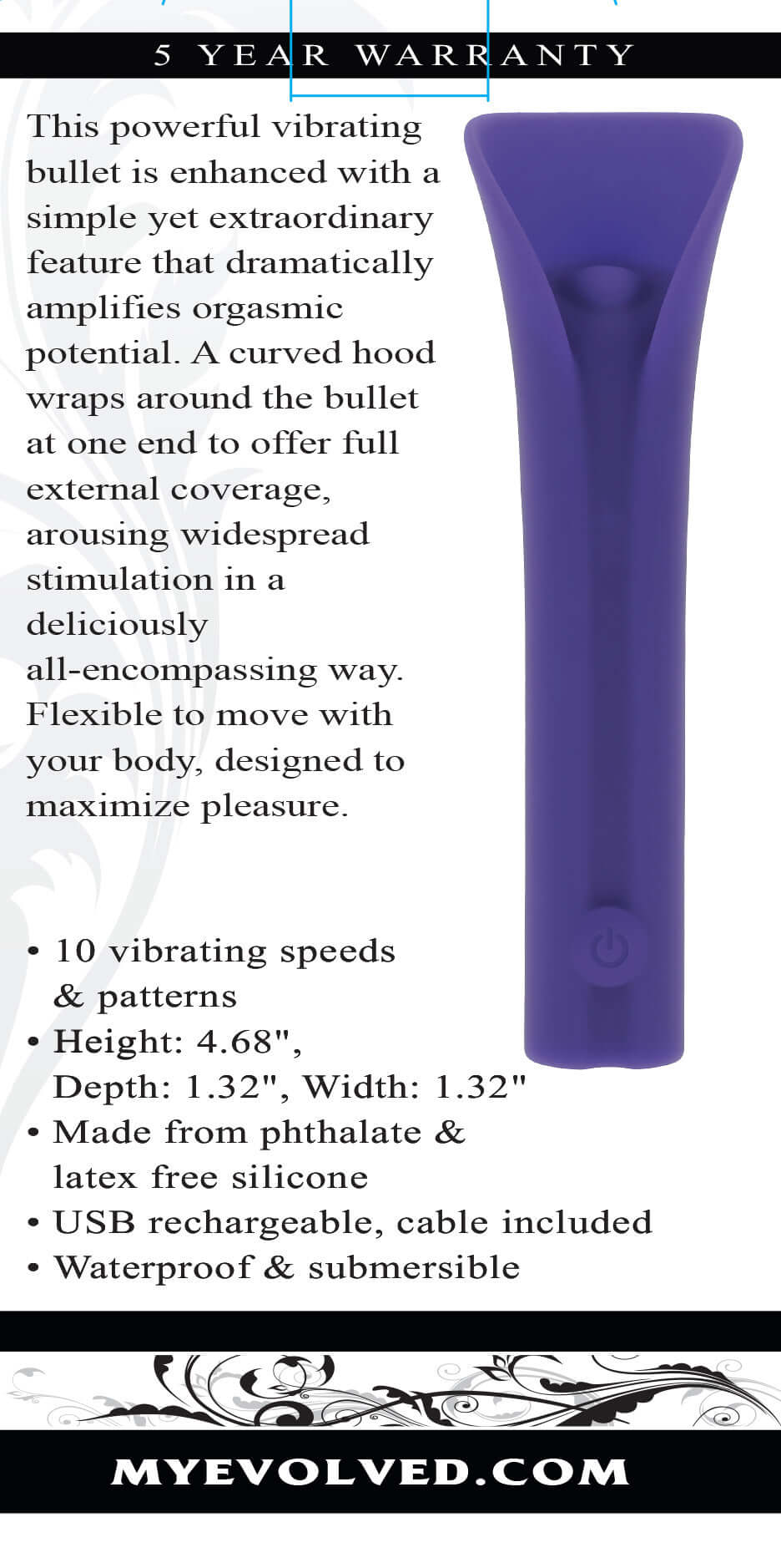 This powerful vibrating bullet is enhanced with a simple yet extraordinary feature that dramatically amplifies orgasmic potential. A curved hood wraps around the bullet at one end to offer full external coverage, arousing widespread stimulation in a deliciously all-encompassing way. Flexible to move with your body, designed to maximize pleasure.