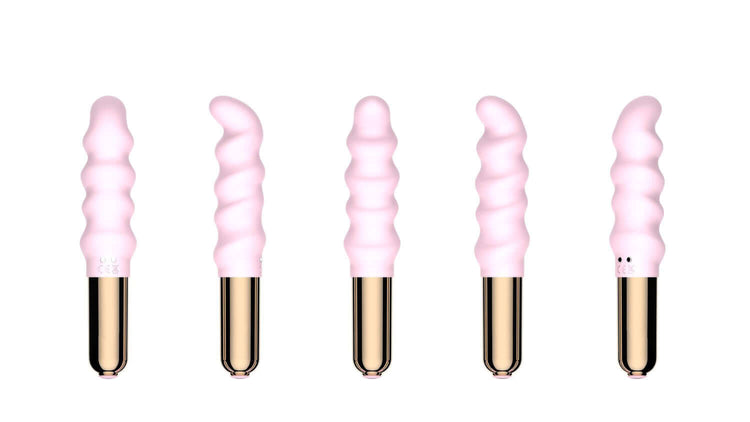 The Be Twisted Bullet Vibe will have you twist and shout with pleasure! The velvety smooth silicone shaft is sculpted from head to hilt with sensory swirls that are perfect for either intenal or external play. Featuring an ergonomic design, with luxe rose gold handle that is delightful to hold. The Be Twisted's curved head expertly pleases the G-Spot, while the shaft works to manually twist or thrust internally at your own pace, as well as to tease and stroke externally, working as a perfect 'grinding' toy for the textured-loving queens. With it's strawberry ice cream silhouette, the Be Twisted is an adorable blend of form and function that with a will have you happily screaming for more!