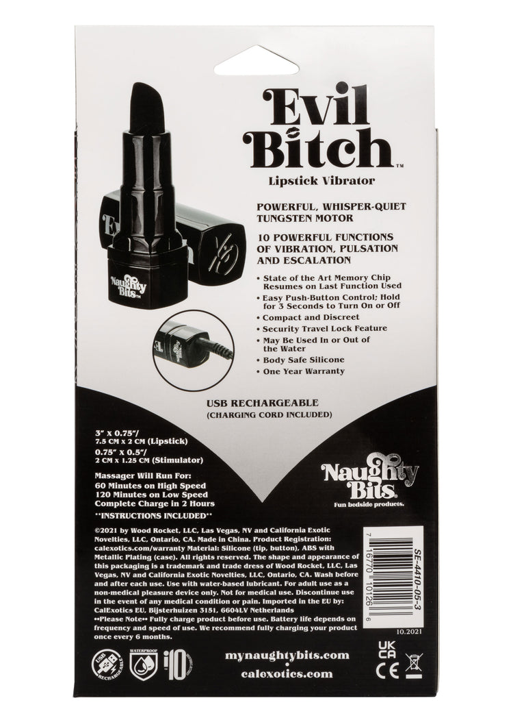 Watch out, the Naughty Bits Evil Bitch Lipstick Vibrator is naughty and nice. The edgy black lipstick design, 10 powerful vibration functions and whisper-quiet tungsten motor are made to thrill wherever your adventures take you. The angled tip is made to deliver pinpoint stimulation or full-contact pulsation to your favorite pleasure points. Blushing beginners will adore the powerful vibrations the whisper-quiet motor puts out. Indulge in 10 high-intensity functions of vibration with the sleek silicone button and hold for 3 seconds to turn on/off. The Naughty Bits collection is made to stand out in any nightstand with eye-catching designs and orgasmic features. The ultra plush silicone and edgy details of this gorgeous mini massager will make even the most stylish lover smiling before and after. Charge up your passion in only 2 hours by plugging the provided USB cable into the self-sealing charging port on the back of the massager. Get playful with up to 60 minutes of high intensity with every charge. The slim massager discreet 4" (10.16 cm) size makes it the perfect travel companion, letting you embrace radiating pleasure wherever your fantansies take you.