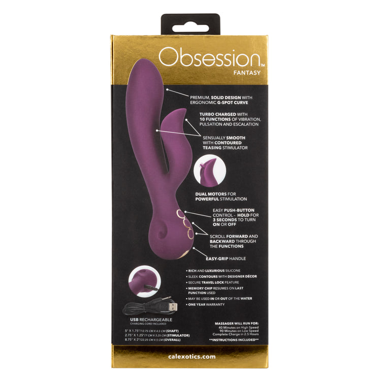 Decadent pleasure is at your fingertips with the indulgent Obsession Fantasy. The turbo-charged dual vibrator is sure to satisfy with the intimately curved shaft, flickering teaser, and 10 powerful functions of vibration.