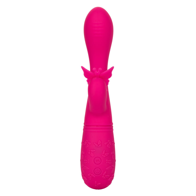 Designed for intimate pleasure, the Rechageable Butterfly Kiss Flutter is an erotic toy box must-have for any pleasure lover. This sensually contoured massager is here to super-charge your pleasure with 10 functions of vibration, powerful dual motors, and fluttering butterfly teaser. The blushing butterfly is a perfect option for beginners and a sensual option for the erotically experienced. Indulge in 10 power-packed functions of vibration, pulsation and escalation with the push-button control. Dual high-intensity motors put out knee-shaking vibration throughout every inch of this passionate vibrator. The fluttering wings and antennae of this flexible butterfly flutter faster with every change of vibration to tickle external sweet spots. Get playful with up to 55 minutes of low speed or 40 minutes of high speedvibrations with the easy touch button control. Recharge your pleasure in only 1.25 hours with the provided USB charging cable.
