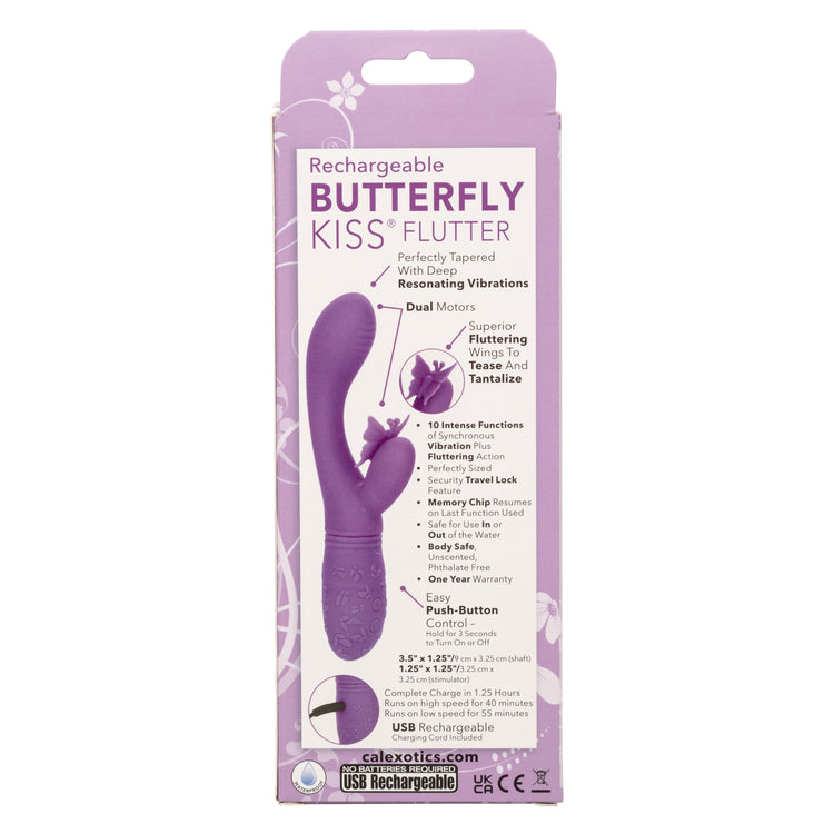 Designed for intimate pleasure, the Rechageable Butterfly Kiss Flutter is an erotic toy box must-have for any pleasure lover. This sensually contoured massager is here to super-charge your pleasure with 10 functions of vibration, powerful dual motors, and fluttering butterfly teaser. The blushing butterfly is a perfect option for beginners and a sensual option for the erotically experienced. Indulge in 10 power-packed functions of vibration, pulsation and escalation with the push-button control. Dual high-intensity motors put out knee-shaking vibration throughout every inch of this passionate vibrator. The fluttering wings and antennae of this flexible butterfly flutter faster with every change of vibration to tickle external sweet spots. Get playful with up to 55 minutes of low speed or 40 minutes of high speedvibrations with the easy touch button control. Recharge your pleasure in only 1.25 hours with the provided USB charging cable.