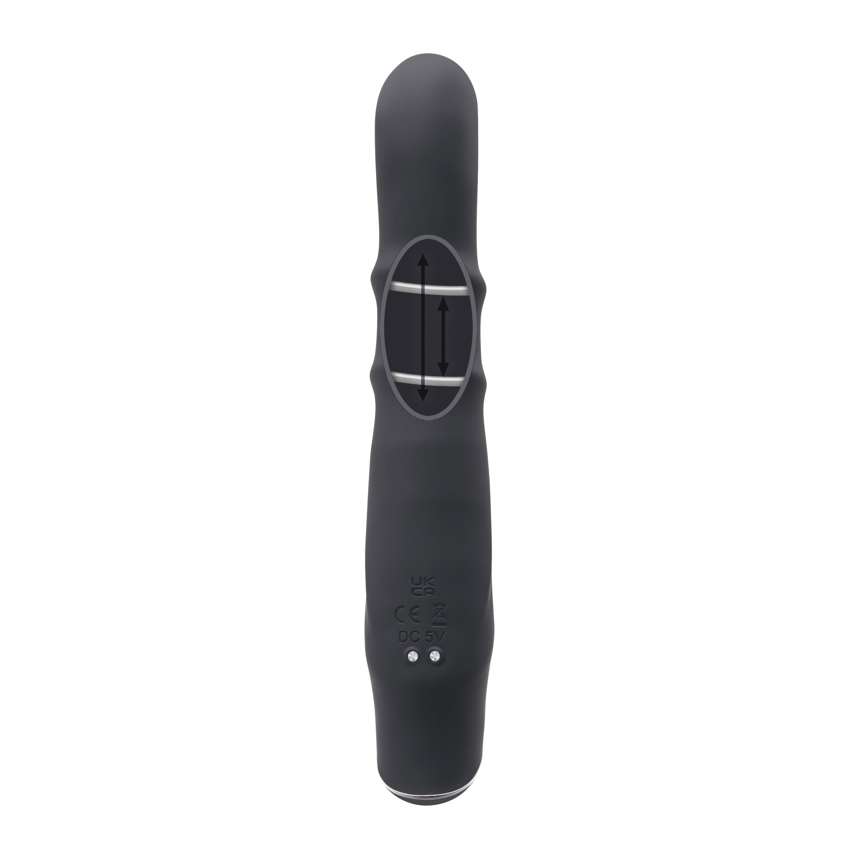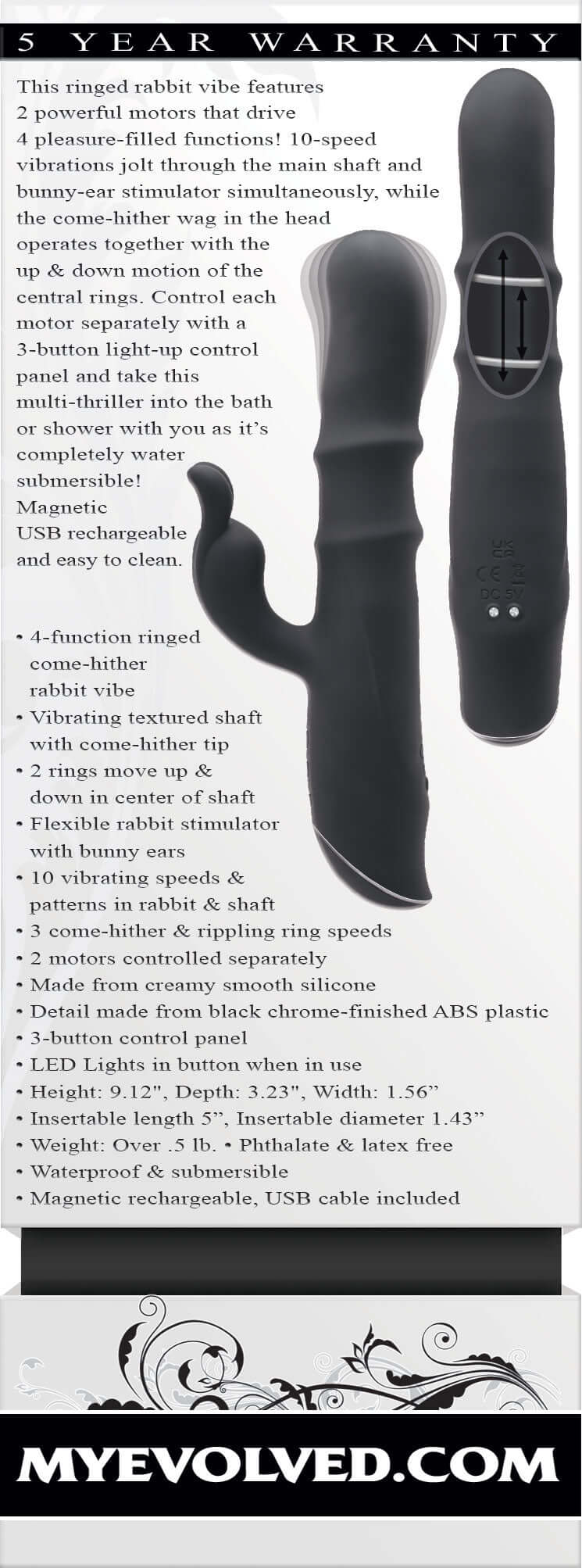This ringed rabbit vibe features 2 powerful motors that drive 4 pleasure-filled functions! 10-speed vibrations jolt through the main shaft and bunny-ear stimulator simultaneously, while the come-hither wag in the head operates together with the up and down motion of the central rings. Control each motor separately with a 3-button light-up control panel and take this multi-thriller into the bath or shower with you as it’s completely water submersible! Magnetic USB rechargeable and easy to clean.