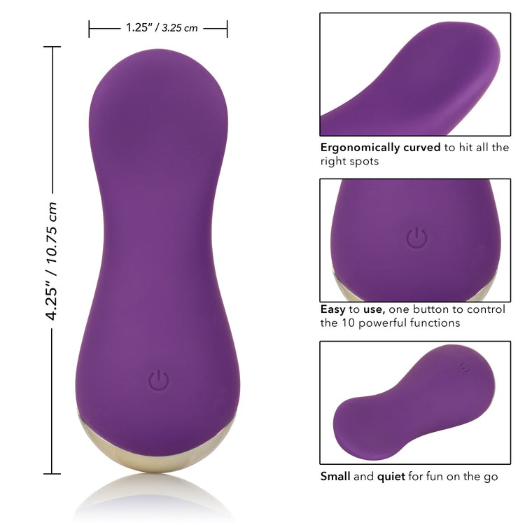 Use the smooth single button control to enjoy up to 1.5 hours of vibrating pleasure. Charge up your passion in only 2.5 hours by plugging the provided USB cable into the self-sealing charging port on the back of the massager. The slim massager discreet 4-inch size makes it the perfect travel companion, letting you embrace radiating pleasure wherever your fantasies take you.