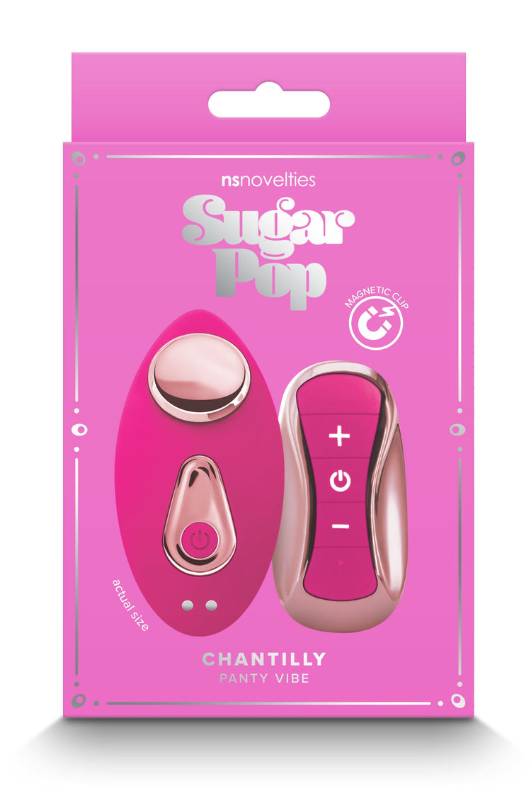 Chantilly by Sugar Pop is a remote-controlled panty vibe made of soft and flexible platinum grade silicone. Featuring a powerful magnet to secure the toy in the proper position, Chantilly delivers explosive stimulation via 10 vibration patterns. Chantilly is water resistant, rechargeable, and suitable with all lubricants / Remote is not. C2032 battery included.