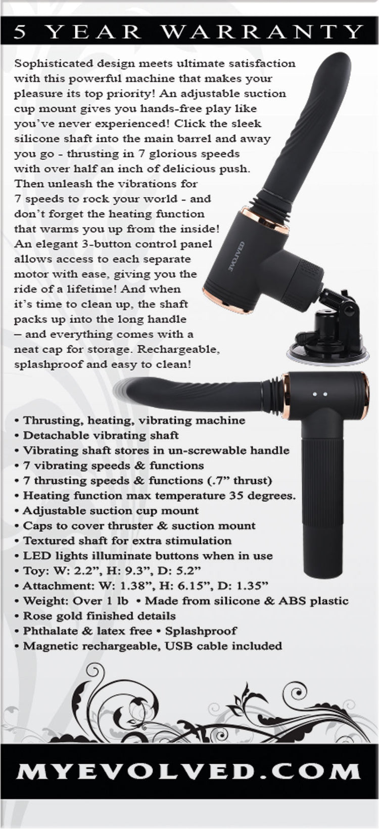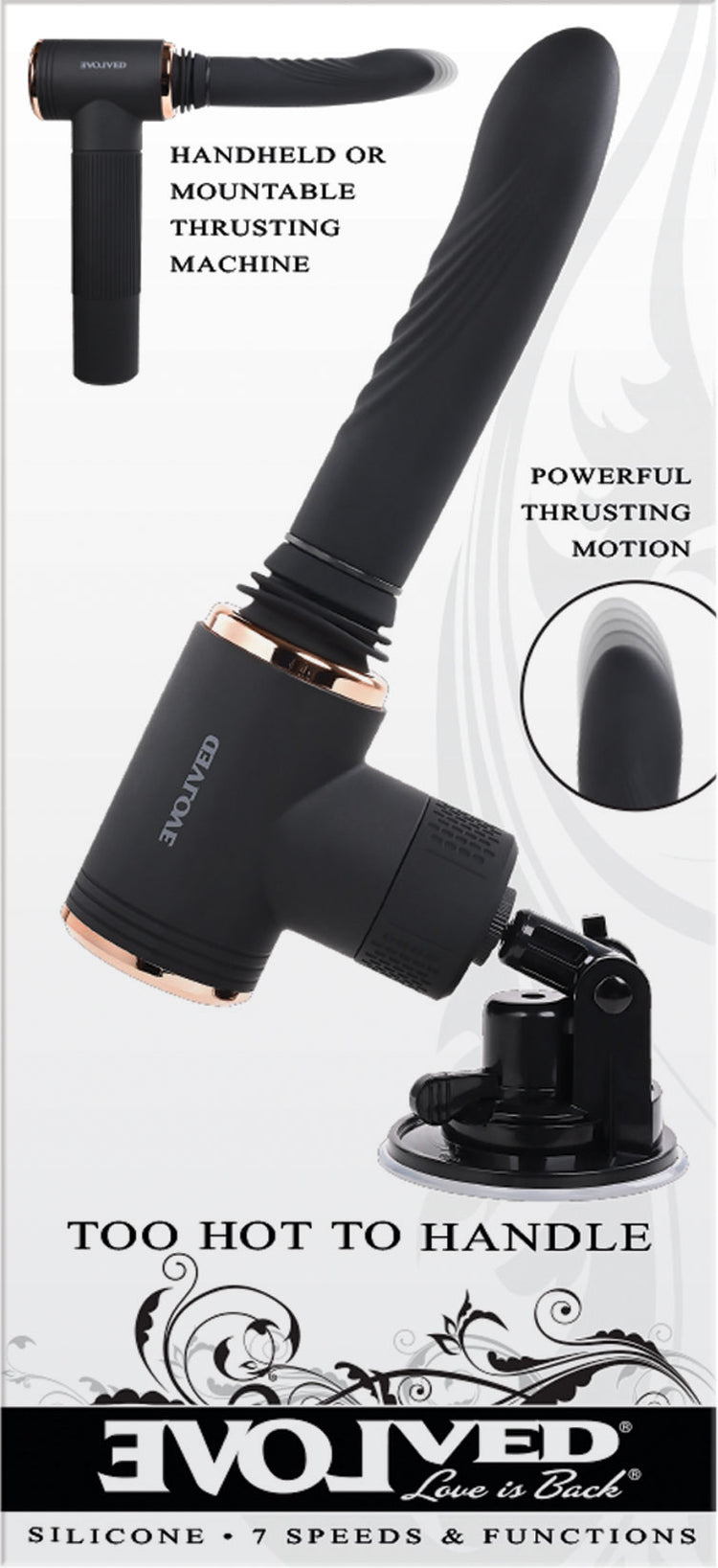 Sophisticated design meets ultimate satisfaction with this powerful machine that makes your pleasure its top priority! An adjustable suction cup mount gives you hands-free play like you’ve never experienced! Click the sleek silicone shaft into the main barrel and away you go - thrusting in 7 glorious speeds with over half an inch of delicious push. Then unleash the vibrations for 7 speeds to rock your world - and don’t forget the heating function that warms you up from the inside! An elegant 3-button control panel allows access to each separate motor with ease, giving you the ride of a lifetime! And when it’s time to clean up, the shaft packs up into the long handle – and everything comes with a neat cap for storage. Rechargeable, splashproof and easy to clean!