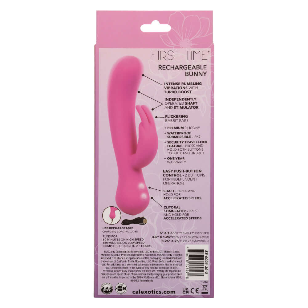 The First Time Rechargeable Bunny stands out with its accelerated speeds,  offering a dynamic range of intensities to explore. Its independently operated  shaft and stimulator ensure a customizable experience, allowing you to explore  pleasure tailored precisely to your desires. Whether you crave gentle caresses  or powerful pulses, this device adapts to your every whim.