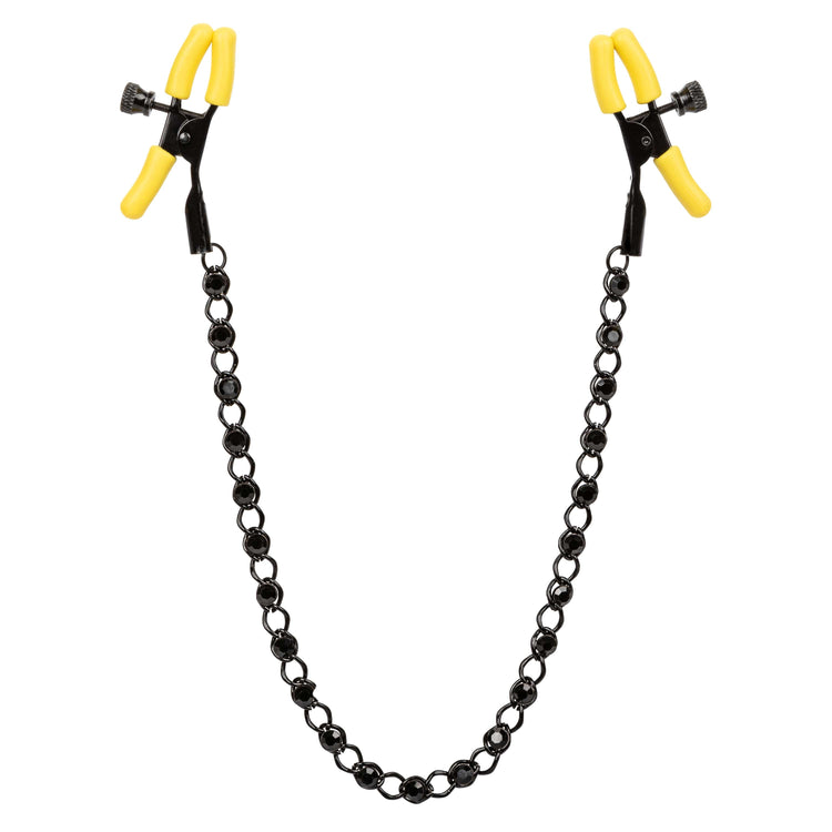 Push yourself towards endless pleasure and embrace the teasing stimulation of the Boundless Nipple Teasers. Explore elevated sensation with the 2 fully adjustable nipple clamps, sensual chain and sparkling crystals.