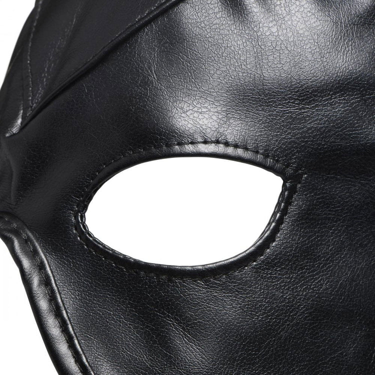 Indulge in your devious dungeon demon side with this bondage hood with horns! Made of PU leather, it is faux leather and vegan friendly! The hood shows off your eyes and mouth so you can change your appearance but still enjoy seeing, speaking and tasting whatever your desire! The inner lining is soft and makes wearing this hood pleasant for long periods of time. If you break a sweat, you're in luck! This hood is machine washable.