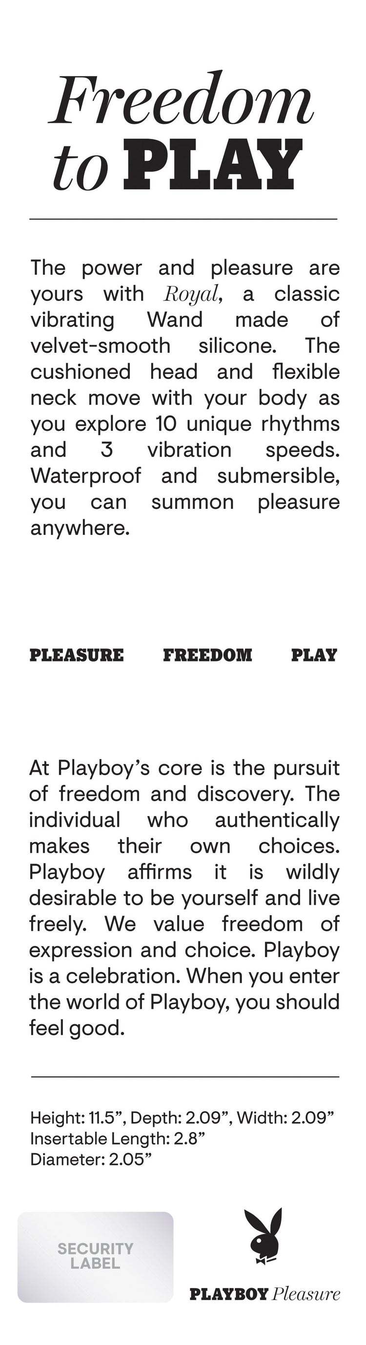 The power and pleasure are yours with Royal, a classic vibrating Wand made of velvet-smooth silicone. The cushioned head and flexible neck move with your body as you explore 10 unique rhythms and 3 vibration speeds. Waterproof and submersible, you can summon pleasure anywhere.