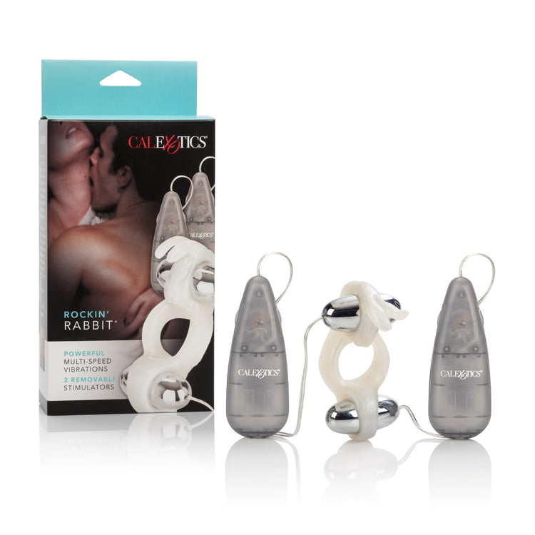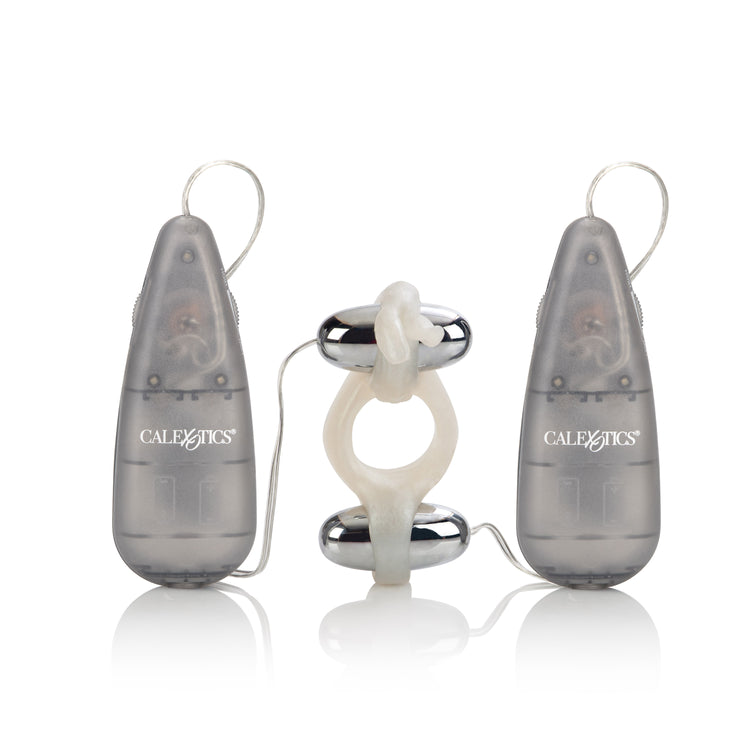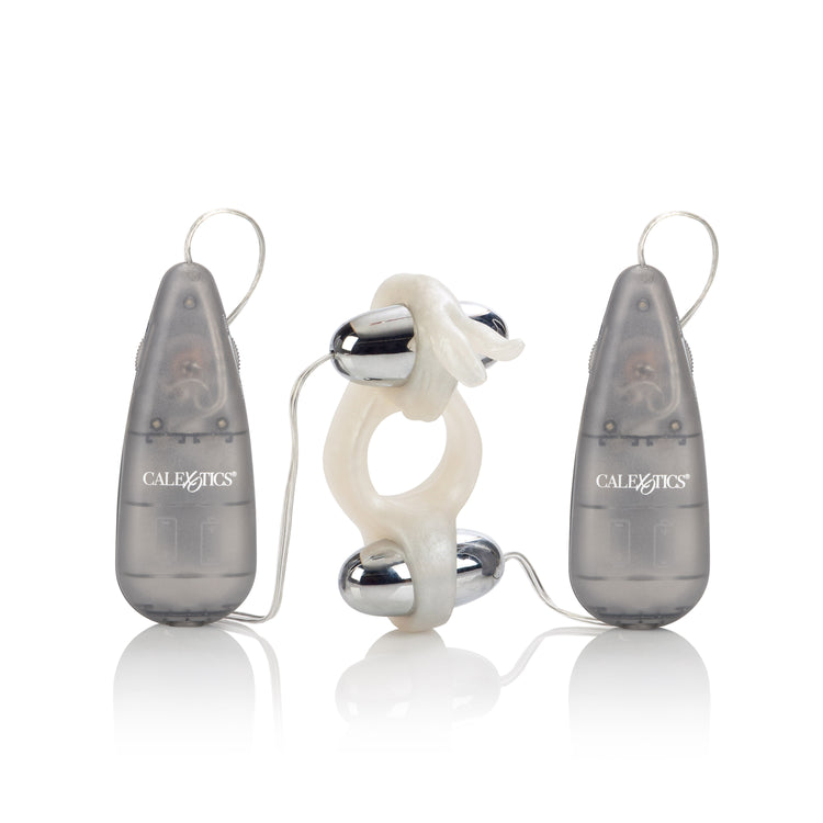 Sturdy erection enhancer with vibrating ears and tail Two multi-speed bullets dual controls for independent use PVC (enhancer) ABS with silver plating (bullets) 4 AA batteries